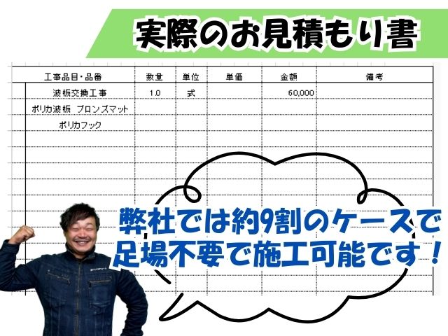 - 料金の明瞭化: 材料費、施工費、廃棄物処分費の内訳をすべて公開。「波板1枚の交換で3.3万円〜」など、具体的な金額例をご提示しています。