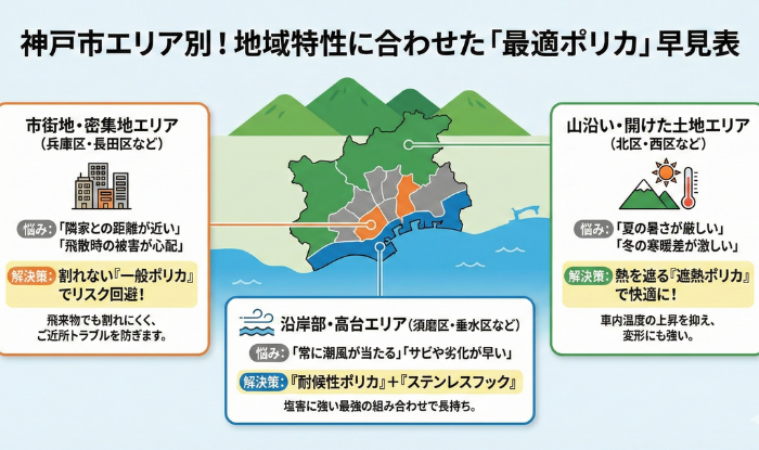 • 神戸の地域特性: 浜風や六甲おろしなど、風の強い神戸では「割れない」「飛ばされない」素材選びが必須。