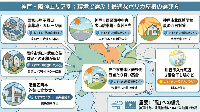 - 神戸市垂水区舞多聞: 日当たりが良い高台エリアでは、熱線遮断タイプにすることで洗濯物を干す際の暑さを軽減できます。
